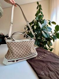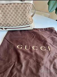Borsa Gucci originale in tela GG Supreme beige con dettagli in pelle bianca e finiture dorate.