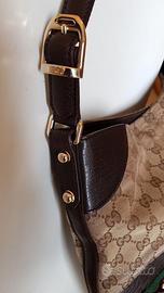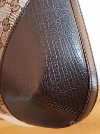 Borsa Gucci 1955 Horsebit originale acquistata nel 2008. Materiale: Pelle e tessuto monogram. Finiture in pelle e ottone in condizioni ottime, così come l'interno. Presenta qualche segno legato all'uso in alto sulla parte in stoffa. Da pulire, ma molto ben conservata. Venduta con la sua dustbag originale. Misure: altezza cm 32, larghezza massima cm 43, profondità massima cm 12. Colore: tessuto monogram beige e marrone, pelle marrone scuro, banda in tessuto verde e rosso.