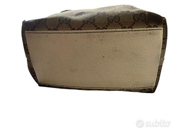 Borsa Gucci Tote a secchiello in tela Monogram Gucci. La borsa è in buone condizioni. Essendo vintage presenta leggeri segni di usura sul materiale e negli angoli visibili in foto. L'interno è foderato in tessuto marrone ed è presente una tasca laterale con cerniera (interni intatti) No dustabg Condizioni esterne: molto buone - normali segni di usura Condizioni interne: molto buone - nessun difetto degno di nota Materiale: pelle canvas Dimensioni: 18 x 25 x 9 cm Numero di serie/codice dati: 153361203998