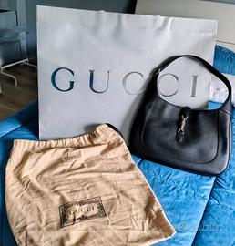 Borsa a spalla Gucci Jackie 1961 nuova mai usata ancora nella sua confezione originale con nuova chiusura a pistone color oro chiaro presenta una raffinata pelle nera , la forma a mezzaluna e la silhouette elegante dell'iconica borsa della Maison. Questo modello di dimensioni grandi è dotato di un nastro Web rosso e verde per diverse opzioni di stile.