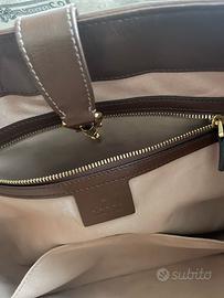 Metto in vendita questa splendida borsa Gucci Jackie 1961 nella ricercata misura Medium. Un pezzo intramontabile, perfetto per chi cerca eleganza e capienza in un unico oggetto di lusso. La borsa è stata conservata con estrema cura ed è in condizioni eccellenti. Dettagli principali: • Modello: Jackie 1961 Medium (misura grande/media). • Materiale: Tessuto GG Supreme (tela monogramma) con finiture in pregiata pelle marrone. • Hardware: Iconica chiusura a pistone in metallo color oro lucido (perfettamente funzionante). • Interno: Fodera in microfibra con finitura effetto scamosciato. Tasca interna con cerniera e tasca per smartphone. • Misure (approssimative): 36,5 cm (larghezza) x 24,5 cm (altezza) x 4,5 cm (profondità). Condizioni: La borsa è in ottime condizioni generali. Il monogramma GG è perfetto. La pelle marrone è ben tenuta, con lievissimi e normali segni di utilizzo vintage che ne testimoniano l'autenticità e il fascino. L'hardware dorato mantiene la sua brillantezza originale. Accessori inclusi: • Borsa Gucci Jackie 1961 Medium. • Seconda tracolla rimovibile (consente di portarla comodamente a spalla o a tracolla). • Dustbag (sacchetto protettivo) originale Gucci.