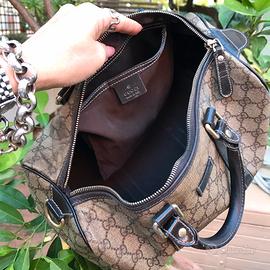 Borsa a bauletto Gucci Joy Boston in monogram con rifiniture in pelle marrone. Logo frontale. Due maniglie con apertura superiore a zip. Interni in tela marrone con tasca aperta, logo e codice di autenticità. Hardware gold logato.