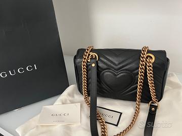 Borsa Gucci Marmont Originale in pelle matelassé nera con motivo chevron ,doppia G e cuore sul retro. •Finiture color oro •Unico scomparto interno con tasca piatta •Tracolla a catena scorrevole •Pattina con chiusura a scatto •Dimensioni: L 22 cm x A 12,5 cm x P 6 cm Borsa originale acquistata presso reseller di articoli di lusso con ricevute disponibili, pari al nuovo. Retail in boutique €2100,00 Solo ritiro a mano. No perditempo.