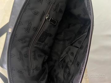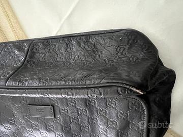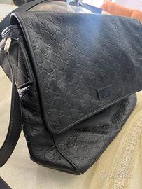Borsa a tracolla Gucci modello messenger in pelle colore testa di moro con motivo GG impresso su tutta la superficie. Misura 40 (B) X 30 (h) cm. Realizzata in pelle morbida e resistente, presenta chiusura con patta frontale, logo Gucci su placchetta frontale. Tracolla regolabile per utilizzo crossbody o spalla e presenta un ampio scomparto interno ideale per uso quotidiano/lavoro. La borsa è in buone condizioni generali, presenta normali segni di usura sulla parte inferiore (leggera abrasione agli angoli/base), mentre il resto della pelle e degli interni è ben conservato