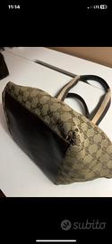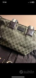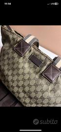 Vendo borsa originale GUCCI in tela GG beige/verde con iconico motivo monogrammato. Dotata di doppi manici in tessuto con inserti in pelle marrone, è perfetta per un look elegante ma pratico. Il design classico e senza tempo la rende adatta sia per l’uso quotidiano che per occasioni speciali.