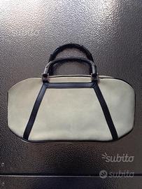Borsa Gucci in suede con riporti in pelle nera. Manici in bambù. È un bauletto da portare a mano. Mai usata. Fodera interna in tessuto logato. Con i manici è alta 30 cm. Larghezza 37 cm base 12 cm. Completa di dustbag