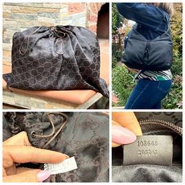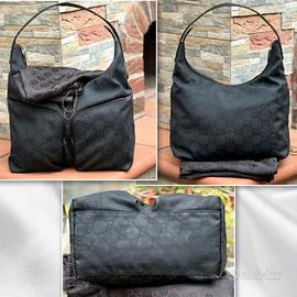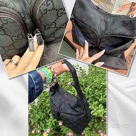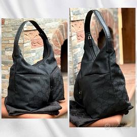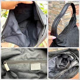 Borsa a spalla Gucci Hobo in tela monogram GG e rifiniture in pelle nera. Due tasche frontali a zip (di cui un tirante sostituito ma impercettibile). Apertura superiore a zip. Interni in tela nera con una tasca a zip con tirante in metallo logato, logo e codice di autenticità. Corredata della sua dust bag. Misure: L 29 X H laterale 31 “ “ “ X H centrale 23 Profondità 15