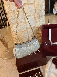 Mini borsa gucci ophidia e pefetta se vuoi in un accessorio elegante e in formato ridotto ma che resti pratico per l’uso di tutti i giorni Caratteristiche : Colorazione beige e bianco Manico a catena color oro Dimensioni 19x10x3 Tessuto doppia g Spedizione veloce