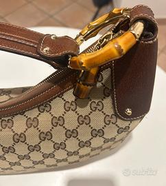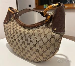 Vendo magnifica borsa "Gucci Bamboo Ring Hobo Bag"in tela monogram GG beige/marrone con finiture in pelle marrone. Questo modello è noto per la sua caratteristica tracolla ad anello in bambù e la forma a mezzaluna. Tenuta in modo maniacale praticamente nuova come si vede in foto. Non accetto offerte a ribasso ne affaristi.