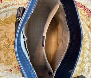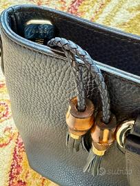 Borsa Gucci in pregiata pelle martellata blu con tracolla amovibile, nappe decorative con dettaglio bamboo e parti metalliche oro in perfette condizioni. Dotata di doppi manici superiori ed una tracolla in pelle staccabile e regolabile, per portarla a mano, a spalla o a tracolla. Esterno in pelle di vitello e fodera interna in tessuto con una tasca con zip e due tasche aperte. La borsa è completa di dustbag originale. Misure: 36x27x10