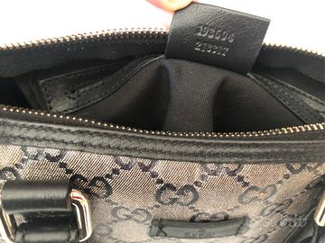 Vendo borsa Gucci originale, modello Boston, tessuto GG metalizzato lucido e finiture in pelle nera, manici in pelle, chisura con cerniera, ha una tasca interna, borsa tipo bauletto. È in perfette condizioni.
