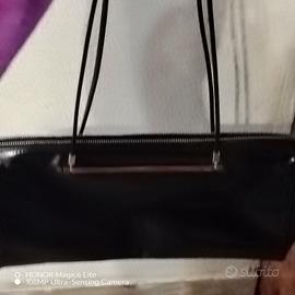 Modello allungato con manici in pelle sottili collegati a una barra rigida in metallo dorato, dettaglio iconico dello stile Gucci d’epoca. Chiusura con zip, linee pulite e finitura lucida naturale. Un accessorio classico e senza tempo, perfetto per chi ama il vero vintage di lusso.