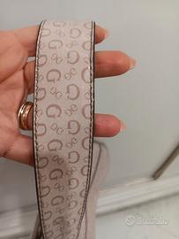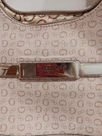 borsa beige in similpelle con dettagli lucidi .foderata internamente con iconica stampa Guess e taschini interni .chiusa con zip e logo metallico frontale .tracolla a spalla che può esser portata anche a mano .in ottime condizioni come nuova