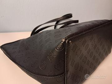Borsa Vikky Logo Guess, originale, a Spalla L: spaziosa tote bag in similpelle logata con maxi pochette rimovibile per portarla a mano, comparto foderato, e comodi manici, colore nero. Lunghezza 32 cm, Altezza 27 cm, Profondità 15 cm. Leggermente usurata in un angolo in basso, visibile se capovolta.