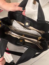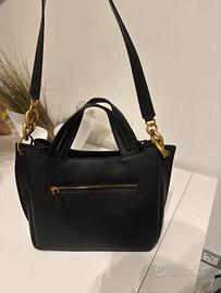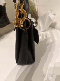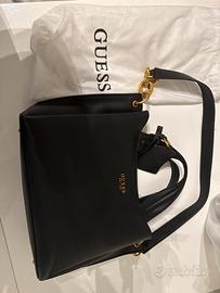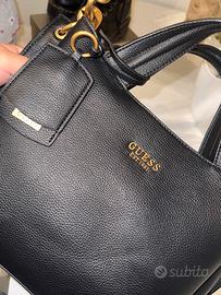 Borsa guess nera a spalla con dettagli oro opaco, capiente. Uno scomparto centrale con lampo, due scomparti laterali con bottone e tasca con cerniera porteriore.