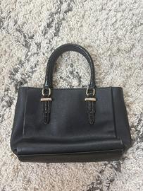 Borsa a mano Guess nera, modello vintage con logo dorato sul fronte e manici rigidi.