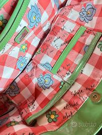 Borsa tote bag Guessin similpelle verniciata verde mela, con grandi loghi "G" trapuntati sulla parte anteriore e un ciondolo a forma di trifoglio sul manico.
