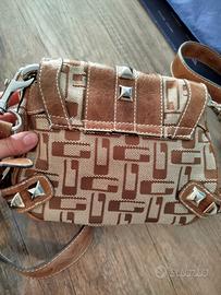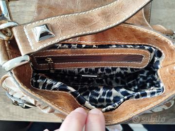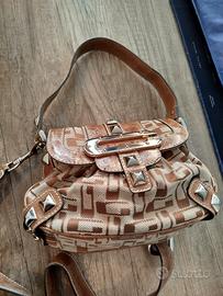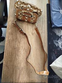 piccola borsetta di marca Guess a stampa color oro/beige con logo del marchio stampato. È in ottime condizioni e perfettamente conservata. inoltre può essere portata sia a mano oppure a tracolla.