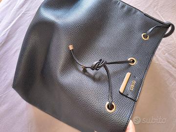 Borsa Guess color nero pece. Il design è caratterizzato da una raffinata texture martellata e dettagli metallici color oro pallido che aggiungono un tocco di luce. La chiusura a coulisse non è solo funzionale, ma dona un’allure casual-chic perfetta sia per l'ufficio che per un aperitivo in centro. Spaziosa, versatile e in condizioni impeccabili.