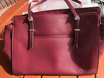 Borsa bordeaux35 centimetri di lunghezza e 25 di altezza cerniera esterna e interna con altre due taschine interne.. Ha le maniglie un po usurate
