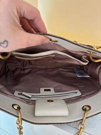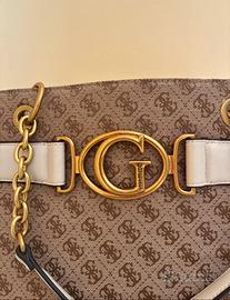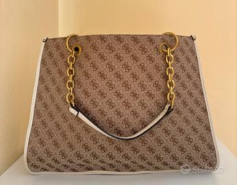 Bellissima borsa GUESS originale stile anni 2000 (Y2K), con iconica stampa monogram e grande logo dorato frontale. ✨ Dettagli: • Colore beige/marrone • Inserti in ecopelle chiara • Dettagli e catena dorati • Manici comodi + possibilità tracolla • Interno ampio con tasche e zip 📌 Condizioni: Ottime, con normali segni d’uso (visibili in foto) ✔️ 100% originale Perfetta per outfit vintage, streetwear o casual chic. 💰 Prezzo: 50€ trattabili 📦 Spedizione veloce disponibile 📩 Scrivimi per info