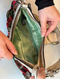 Splendida borsa a spalla firmata Guess, pezzo autentico degli anni 2000 stile Y2K / McBling. Un accessorio raro e super particolare, perfetto per chi ama i look vintage e audaci. • Dettagli: Corpo in tessuto nero con ricami floreali rossi e verdi in rilievo. • Finiture: Inserti in ecopelle bianca con texture effetto coccodrillo e pitone. • Hardware: Grande logo "G" centrale in metallo argentato circondato da strass luccicanti (tutti presenti). Pendente laterale con logo Guess e cuoricino. • Interno: Fodera con taschino interno con zip. Chiusura esterna magnetica. • Condizioni: come da foto Perfetta per completare un outfit anni 2000 con jeans a vita bassa o un mini dress!