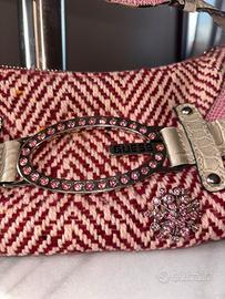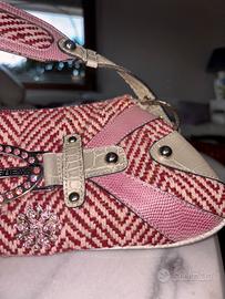 Splendida borsa a spalla firmata Guess, un vero pezzo iconico degli anni 2000. Caratterizzata da una lavorazione in tweed a spina di pesce bordeaux e panna, arricchita da inserti in ecopelle effetto serpente rosa e coccodrillo bianco.