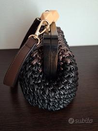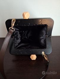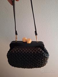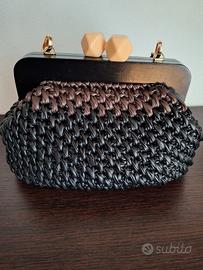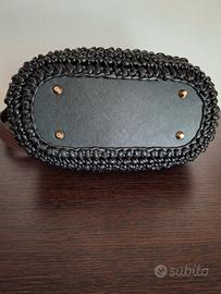 borsetta all'uncinetto fatta interamente a mano in filato ecopelle due colori (nero e marrone) internamente foderata cucita a mano manico in legno tracollina in ecopelle fondo in ecopelle