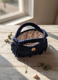 Borsa artigianale realizzata a mano in fettuccia di cotone blu scuro. Caratterizzata da lunghe frange sui lati e davanti.
