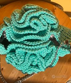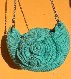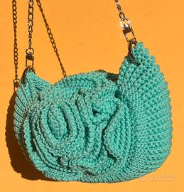 Elegante borsa artigianale realizzata interamente a mano, caratterizzata da uno splendido design a rosa in rilievo sia sul davanti che sul retro🌹 Il delicato color Tiffany la rende fresca, raffinata e perfetta per la stagione primavera/estate, ideale per dare un tocco originale a qualsiasi outfit. 🔹 Dettagli: Lavorazione handmade con cordino resistente Design unico a forma di rosa Colore Tiffany luminoso e di tendenza Tracolla con catena in metallo Struttura morbida ma capiente Pezzo unico (non industriale) Perfetta per chi ama accessori particolari e artigianali 💫 Ideale anche come regalo originale.