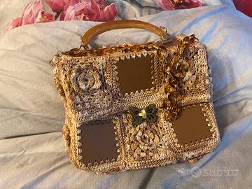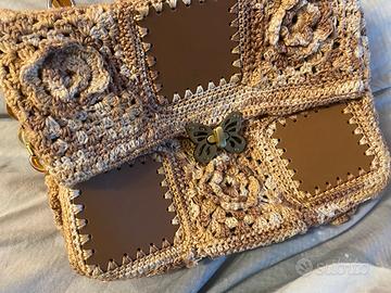 Vendo borsa è realizzata a mano all’uncinetto in cotone. È formata con mattonelle granny in rilievo alternate a mattonelle in ecopelle. Internamente è completamente foderata. È dotata sia di manico a mano che lungo, entrambe in resina. La chiusura è a forma di farfalla colore ambrato. Prezzo trattabile