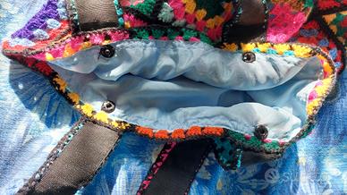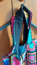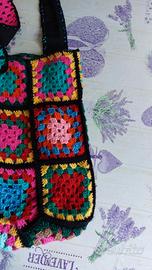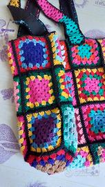 Borsa fatta a mano uncinetto di lana, composta da 27 quadrotti/mattonelle con molteplici colori. Interno foderato, chiusura con bottoni automatici. Molto elegante in qualsiasi situazione. Dimensioni: altezza 33 cm x lunghezza 33 cm x profondità 11 cm. Tracolla lunghezza 65 cm x larghezza 5,5 cm rinforzata con canape' nero.