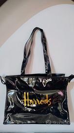 Borsa a tracolla Harrods in PVC nero lucido con scritta oro. Chiusura con zip, tasca interna con zip, condizioni perfette.