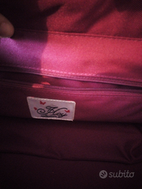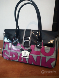 Borsa "Hello Spank" originale, modello a spalla e a mano, interno viola molto capiente, esterno nero in vernice con dettagli fucsia e a quadri.