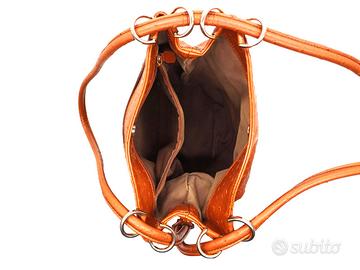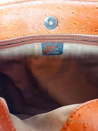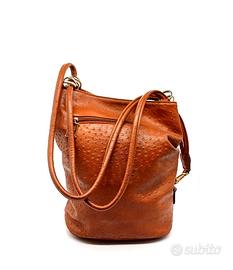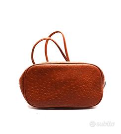 Borsa Hermès 100% pelle di struzzo, anni ’80, marrone cognac, elegante e versatile. Base rettangolare con angoli stondati e struttura morbida a sacco. Texture a piccoli rilievi uniformi, finitura liscia. Chiusura a calamita, tasca esterna con zip con tiretto inciso marchio “H”, manici in pelle collegati con anelli metallici, interno con scomparto unico e tasca foderata. Retro con marchio “H” forato su pelle. Dimensioni: 25 x 15 x h 35 cm, manici L 33 cm. Stile classico senza tempo di valore estetico e qualitativo, vintage alta gamma, apprezzato da collezionisti di moda. Condizioni eccellenti, superficie e fodera uniformi senza usure, elementi metallici dorati senza segni di ossidazione leggermente scoloriti dal tempo, etichetta interna usurata.