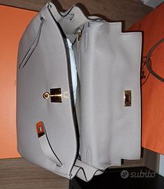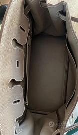 Questa borsa Hermes Birkin 35 è realizzata in pelle Togo colore Gris Asphalt, con hardware in oro. La borsa misura 27 cm di altezza, 35 cm di larghezza e 18,5 cm di profondità, con una lunghezza del manico di 28 cm. La borsa è in condizioni usate, classificata come Rank S, il che indica che è in condizioni eccellenti e come nuova. Viene fornita con una clochette, sacchetto antipolvere, chiave e lucchetto.