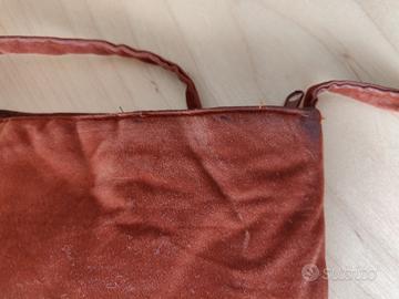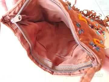 Borsa scamosciata con cerniera e taschino interno. Decori esterni con perline Usata con piccole imperfezioni visibili nelle foto