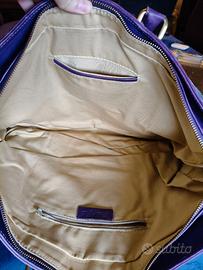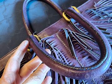 Borsa hippie in pelle, colore viola come da foto, con frange, dimensioni 50 x 40 x 6, condizioni più che buone, tenuta sempre bene e usata poco.