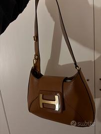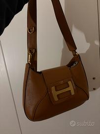 Vendo splendida borsa Hogan originale della linea H-Bag, in pelle martellata color marrone/cuoio con iconica maxi fibbia “H” dorata frontale con logo inciso.