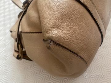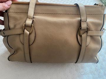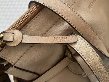 Comoda e capiente borsa a spalla Hogan in pelle color beige, fibbie metalliche marchiate, foderata con