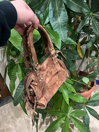 Borsa in vero camoscio realizzata in morbido camoscio autentico, questa borsa presenta dettagli in metallo color ottone e cuciture lavorate con cura. Il design, con piccole frange e zip frontale, richiama le iconiche linee della