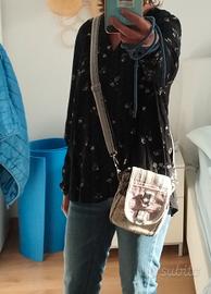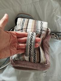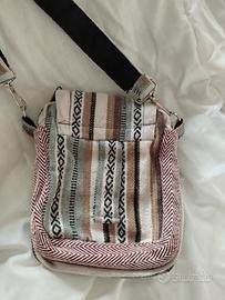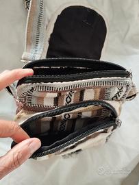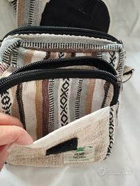 vendo borsa in canapa con due taschini chiusi con cerniera ed uno aperto, sul retro c'è un passante per legarla ad una cintura ed eventualmente utilizzarla come marsupio. la tracolla è regolabile e removibile.