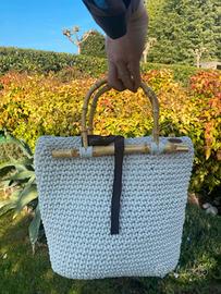 Borsa di corda con manici in legno, bottone di gucci decorativo, completamente foderata e con piedini