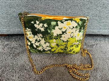 Borsa in cotone interamente fatta a mano Fodera interna in raso giallo Catenella e zip in acciaio color oro Pezzo unico
