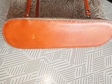 borsa in cuoio con disegni in rilievo. disegni grigi, inserti marrone chiaro. leggermente rigata sul fondo. si può portare in spalla con i manici corti. oppure tirando i manici si può portare a zainetto. spostando i gancetti dalla base e agganciandoli negli anelli sopra, si possono avere i manici più lunghi. usata poco.
