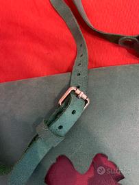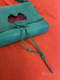 Borsa in Pelle Vera, colore verde e Borgogna, fatta a mano. Presenta una tasca principale e un taschino sottile sotto l’apertura. Decorata in stile fiabesco, con ritaglio a forma di foglia 🍁 sul davanti. Lunghezza cinturino regolabile attraverso una comoda cinghia. Curata in ogni particolare. In ottimo stato .