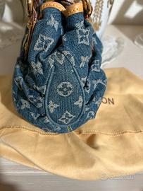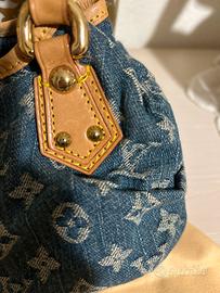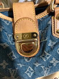 Borsa vintage in denim logata, manici e rifiniture in vera pelle cammello , fascia in pelle con moschettone oro per chiusura , interno in camoscio, usata pochissimo, in perfette condizioni ( presenta solo un piccolo alone sulla fascia in pelle frontale)