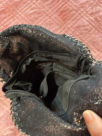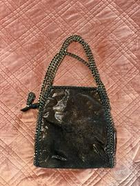 Vendo borsa nera in eco pelle con lavorazione metallica e la presenza di rifiniture con catene argento ci sono due mani maniglie per lato e anche una maniglia centrale sempre realizzata con la catena all’interno. Poi l’apertura è completamente chiusa con la cerniera e ci sono diversi scomparti.