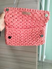 Borsa in fettuccia fatta a mano, colore pesca, con spessore di 5 cm. Tracolla e bottoni calamita argentati