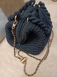 borsa in fettuccia di lycra nera, completamente fatta a mano,chiusura a scatto,manici torscion e tracollina colore oro e pelle nera,regolabile in lunghezza .